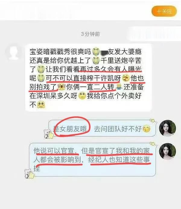 起因是粉丝查到女方的大号,误以为她是私生,因此直接私信对线。这位粉丝没有遮掩,反倒是直接说“再过多久会有人曝光”“直接榨干许凯”“他也别拍戏了”,看起来非常生气。