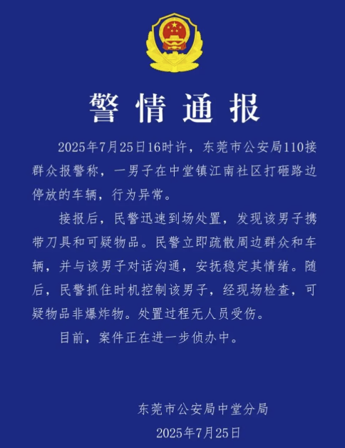 东莞市公安局中堂分局通报,7月25日16时许,东莞市公安局110接群众报警称,一男子在中堂镇江南社区打砸路边停放的车辆速盈策略,行为异常。